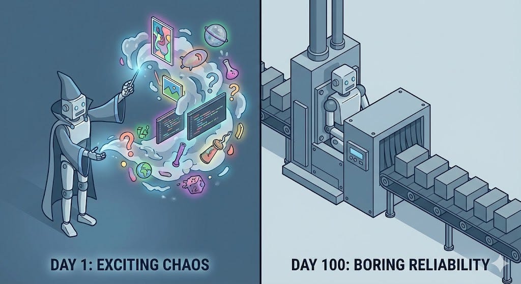 Day 1 (The Demo): Everyone is amazed. The agent takes a vague instruction, reasons through it, and produces a result. It feels like magic. The stakeholders say, “Look how flexible it is!”